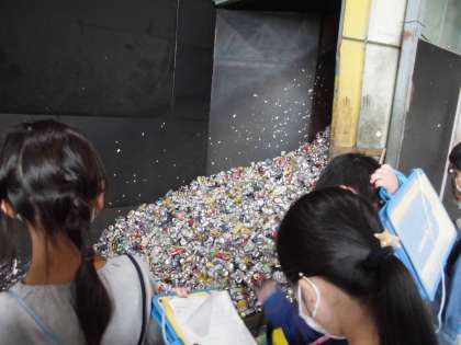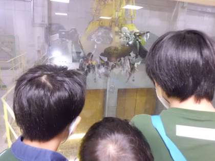 次は、リサイクルセンターに行き、不燃ごみや空き缶、空き瓶の処理やリサイクルの仕組みについて見学しました。ごみピットの見学では、ごみの中にヘルメットや掃除機などの不燃ごみが見え、クリーンセンターのごみの種類との違いを目で確かめることができました。限りある資源を、大切に使うための工夫をたくさん知ることができました。