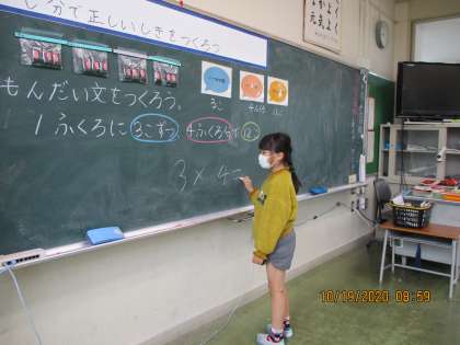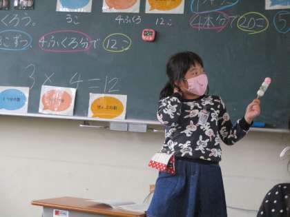 かけ算にでてくる「1つの分の数」と「いくつ分」について、団子を使って学習しました。どこが「1つ分の数」で、どこが「いくつ分」なのか説明しました。