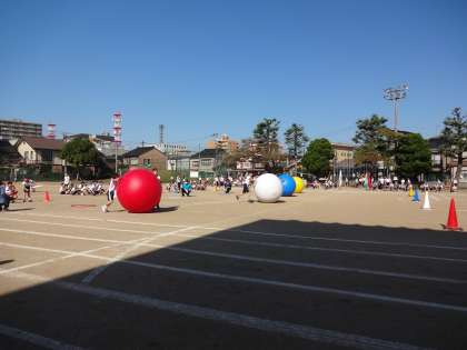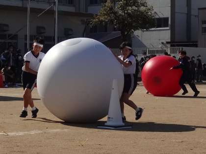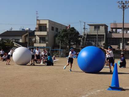 プログラム9番は、3・4年生による大玉転がしです。2人で協力して大玉を転がしました。