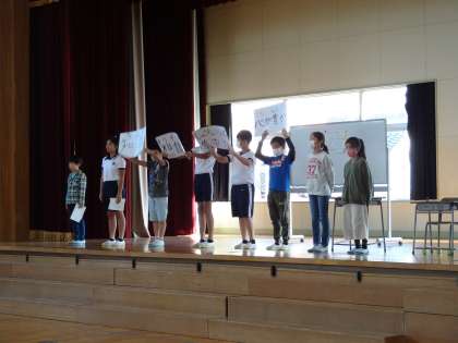 図書委員会の子供たちが、読書週間に、図書により親しんでもらおうと、イベント「秋の読書ビンゴ」「わくわく読書ビンゴ」について発表しました。