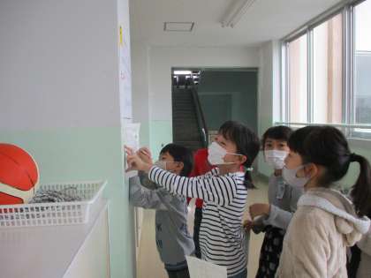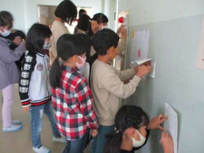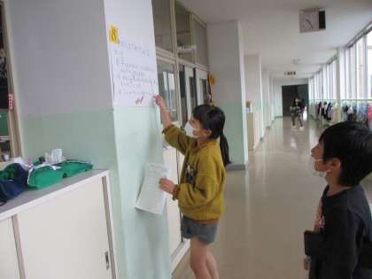 給食委員会の子供たちが考えた10問のクイズにチャレンジしました。2階と3階に掲示されている問題を見て悩む子供たちでした。