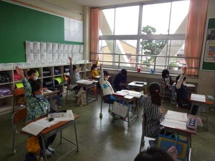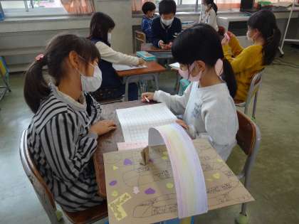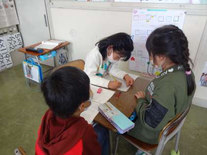 次に、自分たちが作ったすごろくの説明書を書く活動に入りました。どのように書けばよいか、相談しながら進めています。