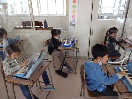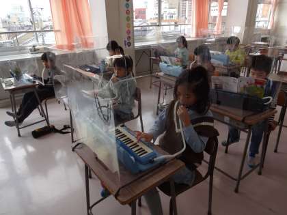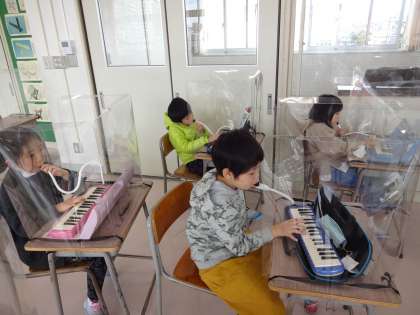 「ひのまる」の曲を鍵盤ハーモニカで演奏する練習をしています。指使いを覚えるために4小節ずつ演奏しています。