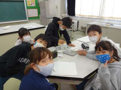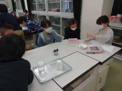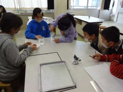 「もののとけ方」の学習では、食塩が水に溶ける量には、限りがあるのかを実験しました。計量スプーンで食塩を入れ、溶けたら、投入です。すぐに溶けないため、交代しながら一生懸命にかき混ぜました。