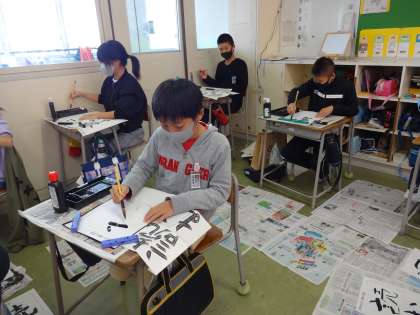 「読む」を清書しました。漢字と仮名の大きさや、縦結びの筆づかいに気を付けて書きました。練習用紙3枚で練習した後、半紙3〜4枚に清書し、その中から一番よいと思うものを選んで提出しました。