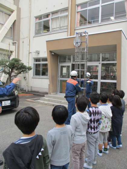 はしごを実際に伸ばしたり、ホースを持って見せてくださったりしました。その度に、1年生からは歓声と拍手が!