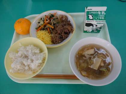 今日の給食のメニューは、ビビンバ、春雨スープ、麦ご飯、みかん、牛乳でした。