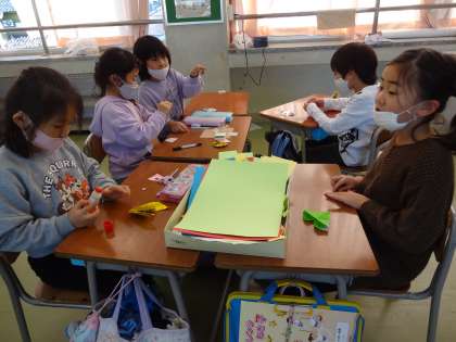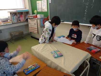 学級の各係どうしで打合せし、連携しながらお楽しみ会の準備を進めています。プログラム、飾り付け、クイズ担当を決めて準備をするなど、自主的に活動しています。