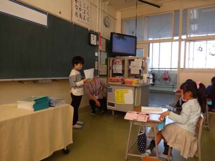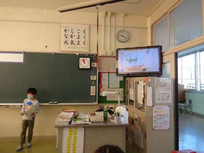 「しらせたいな、見せたいな」の学習では、生き物の観察カードを書き、クラスの友達に発表しました。モニターに観察カードの絵を映しながら、発表原稿を読みました。