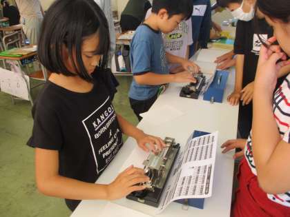 点字がいろいろなところにあることには気付いていましたが、実際にどうやって打つのかは知らなかった子供たち。「てんぴつ」を使ってポチポチと打つのは難しいけれど楽しかったようです。