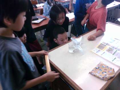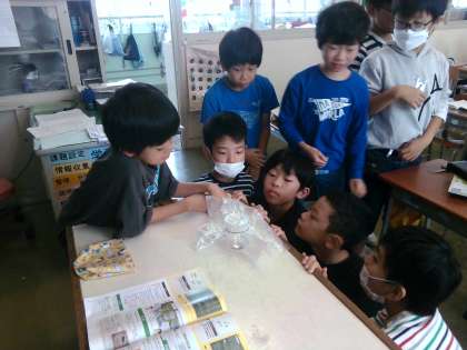 10月4日金曜日に日当たりの良い場所に、100ml入ったビーカーを2つ用意しました。1つは、おおいのあるもの。もう1つはおおいのないものを用意して中身の変化をそれぞれ実験して比べました。今日はその変化を確かめてどんな違いがあったか比べました。