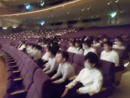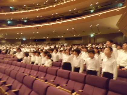 柳町小学校の出番が終わりました。他の学校の合唱を静かに聞いています。第一部の最後には、児童全員で「心が今日も笑顔」を歌いました。