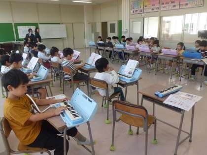 2学期になり、鍵盤ハーモニカの学習が進んできました。ドレミファソの音色を覚えて、聴いた旋律を演奏できる子供たち。友達とやさしく教え合う様子も見られます。