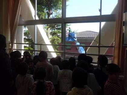 木の剪定作業のため、高所作業車が学校にやってきました。実際に動く様子と見ながら、子供たちはしごととつくりを考えていました。