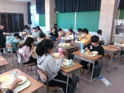 学習参観の会場が視聴覚室のため給食は視聴覚室で食べました。いつもと違う気分でいただきました。
