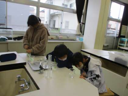 溶け残りの食塩やミョウバンを溶かすにはどうすればよいか、グループで話し合ったところ、「温めるチーム」と「水を増やすチーム」の意見が出てきたので、今日はそれぞれの考えに合わせて実験を行いました。