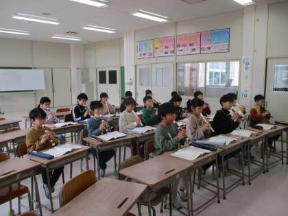 以前柳町小にお勤めされた先生を講師に、リコーダーでの『パフ』の演奏の仕方を教えていただきました。