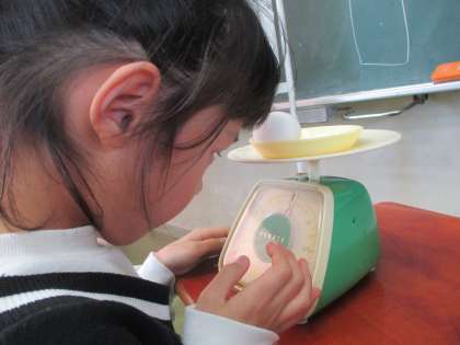給食配膳後、自分のゆで卵の計測をしました。「予想より重かった」と言う子が多い3年1組でした。
