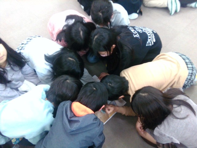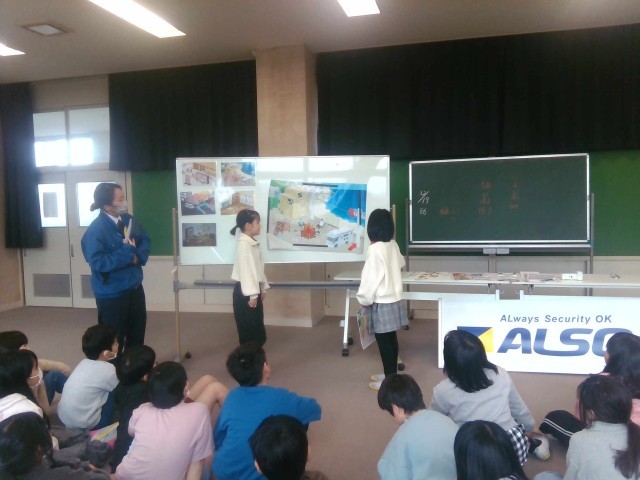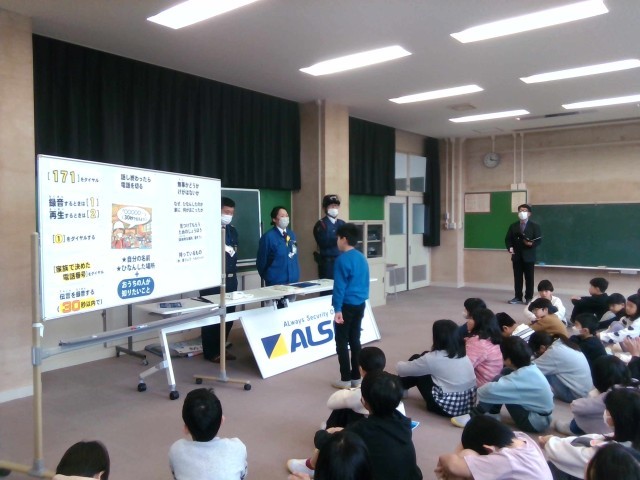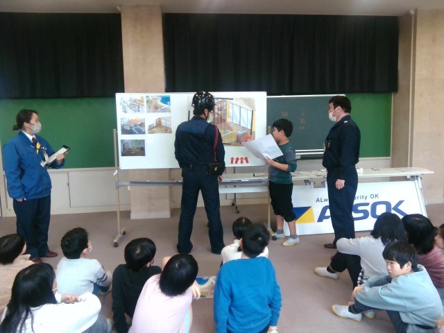 ALSOK安心教室の出前授業を受けました。3、4年生は、防災について学習しました。絵に印をつけて危険な箇所を確認したり、災害時の電話の仕方を確認したりしました。