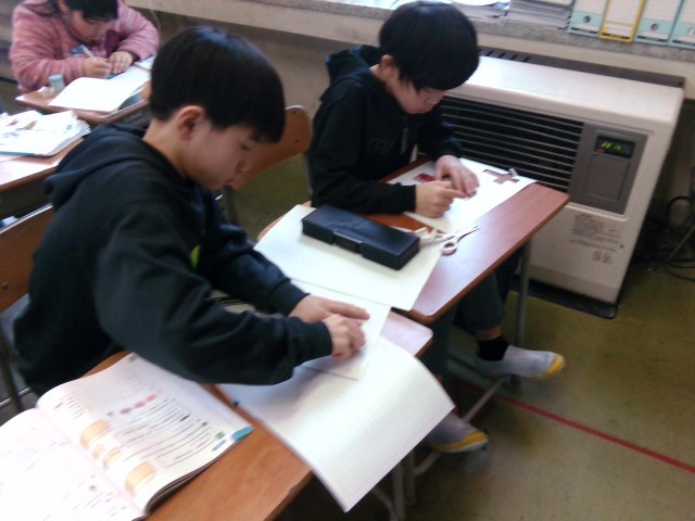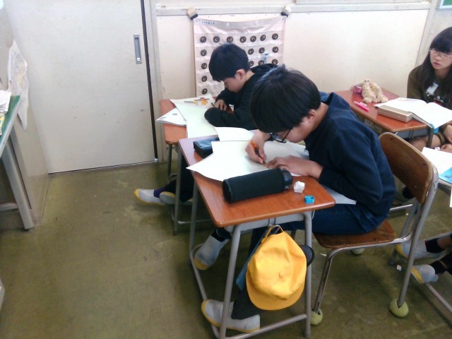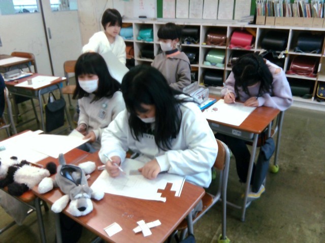 立方体の高さ、縦、横の長さをもとにして展開図を書いています。書いた後は、思い描いた立方体ができたかハサミで切り、確かめました。
