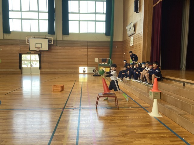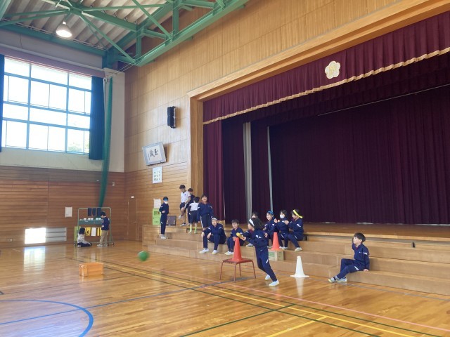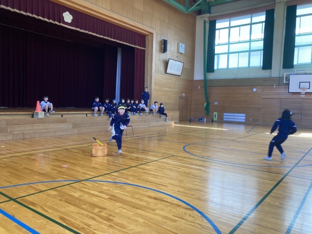 体育館でベースボール型のゲームをしました。昨年経験したことを思い出しながら取り組みました。相手にボールが取られないように考えながら狙いを定めて打ちました。