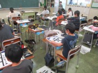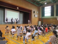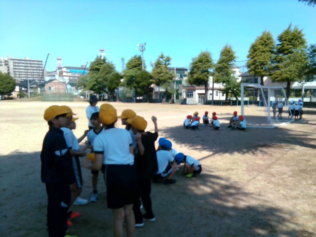 運動会の競技練習が始まっています。80m走はカーブがあるため、今までのコースとは違います。4年生の走る様子から、上手に走る方法を見つけています。80m走の練習の後、団体競技のメンバーや順番を4年生と考えました。
