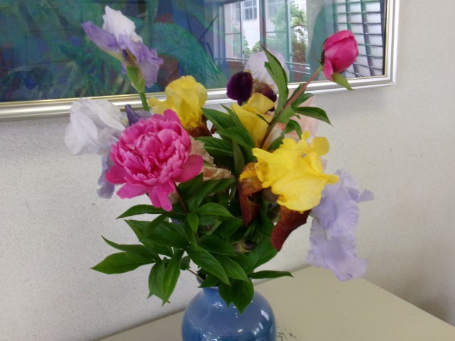 色とりどりのアイリスやシャクヤクが玄関を飾ってくれています。