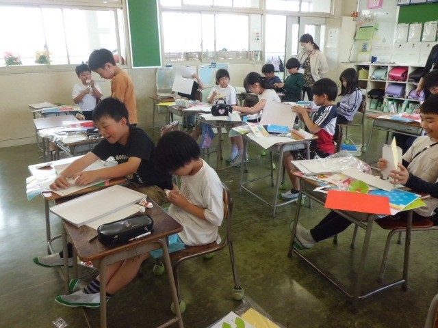 図画工作科では、ビー玉を転がして遊ぶ、立体的なコースを作ります。題して「ビー玉の大ぼうけん」。まずはどのようなコースにするか、設計図を描きました。子供たちはわくわくしながら描いていました。