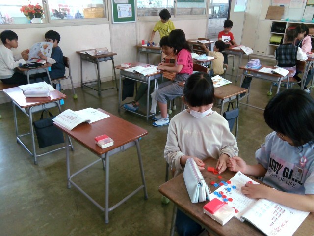 1人分の数を求める計算と何人に分けられるかを求める計算について学習しています。おはじきを使って、考え方の違いを確認しました。