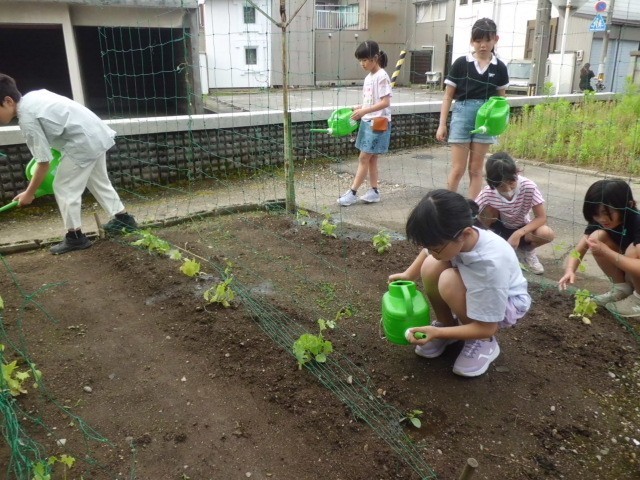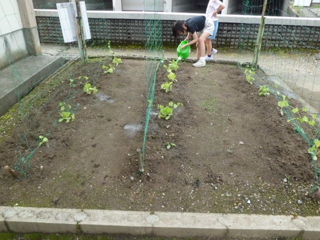 花壇に植えかえたヘチマが育ってきました。朝、登校した子供たちが水やりを頑張っています。