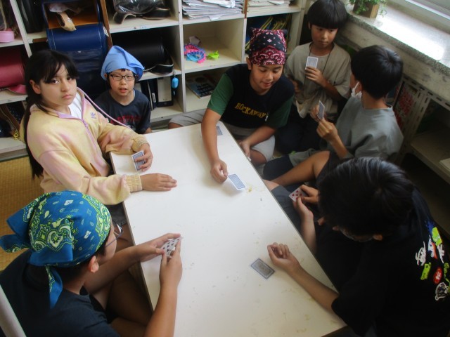 暑いので、教室で仲良く過ごしています。トランプをして異学年と一緒に楽しんでいます。