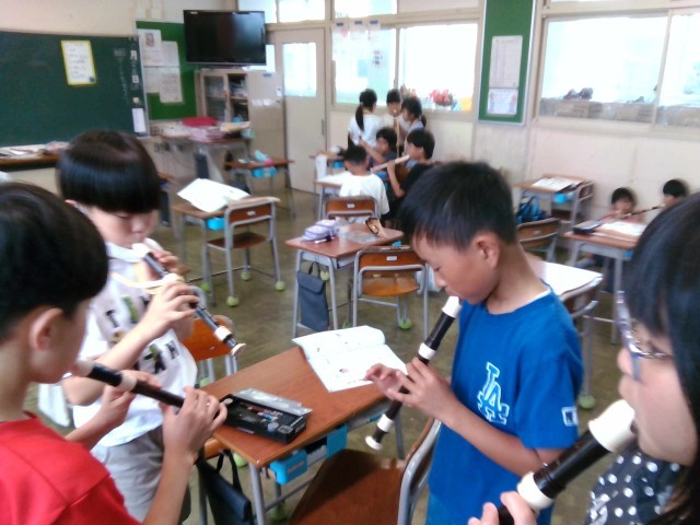 リコーダーの学習です。ソラシドレの音をきれいに出すためには、たくさん気をつけることがあります。「ソの音が難しいな。」小さな指で4つの穴をふさぐことは大変ですが、みんなで楽しんで練習しています。