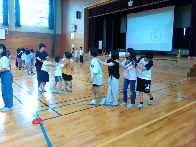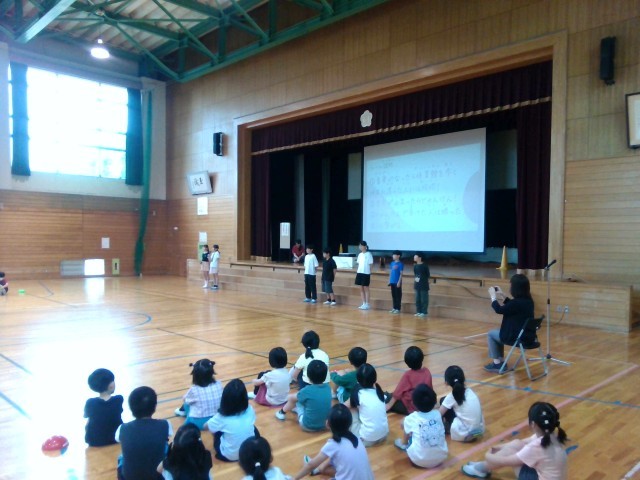 運営委員会による発表のテーマは「あいさつ」でした。気持ちの良いあいさつが全校に広がるように、じゃんけん列車をアレンジした、あいさつ列車を行い、楽しみました。