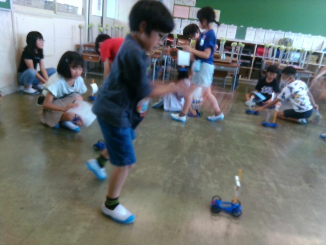 風の強さをかえて、車が動くきょりを調べました。「風が強いと、車がはやく進む。」「風が強いと、車が遠くまで進む。」など、実験から気づいたことを伝え合いました。