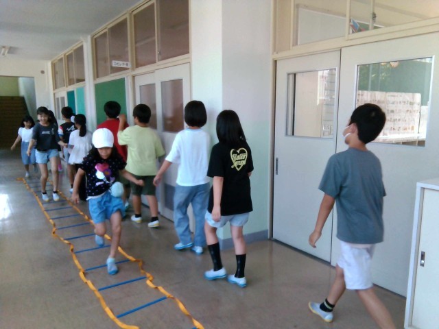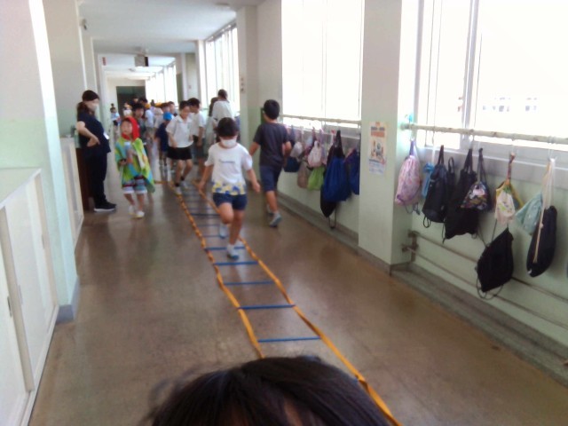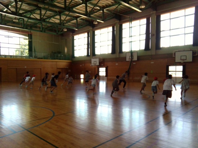 今日のやなトレの様子です。体育館では、赤団がおいかけおにをしています。他の色団は、ラダーにチャレンジです。走力アップに向けて、みんながんばっています。