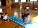 立ち幅跳びと、長座体前屈の測定をしました。立ち幅跳びでは、足を曲げ、両手をしか...