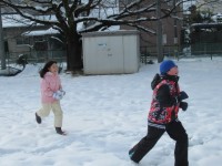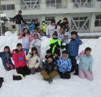 雪が積もったグラウンドで、学級ごとに雪遊びをしました。雪を積み重ねてタワーにする...