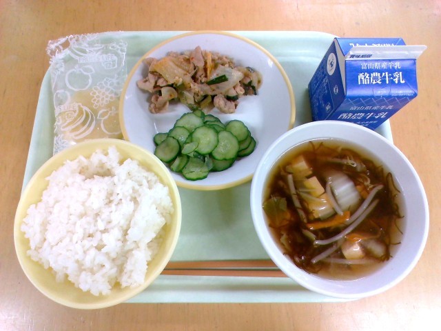 ご飯、牛乳、豚肉キムチ丼、きゅうりもみ、豆腐ともずくのスープ、冷凍パイン