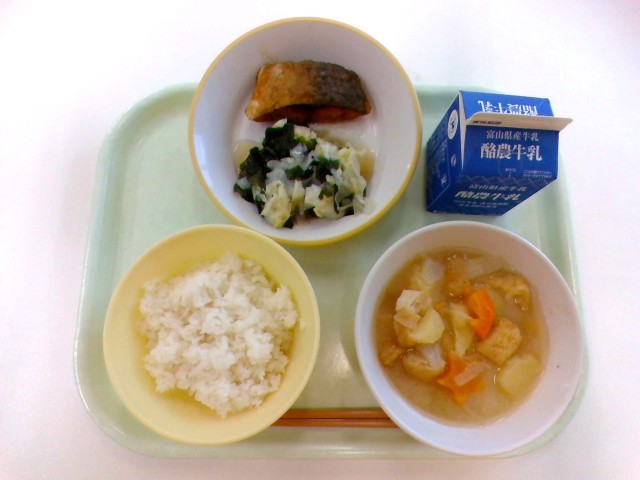 ご飯、牛乳、ふくらぎのかば焼き、酢の物、みそ汁