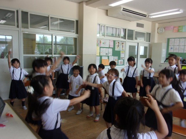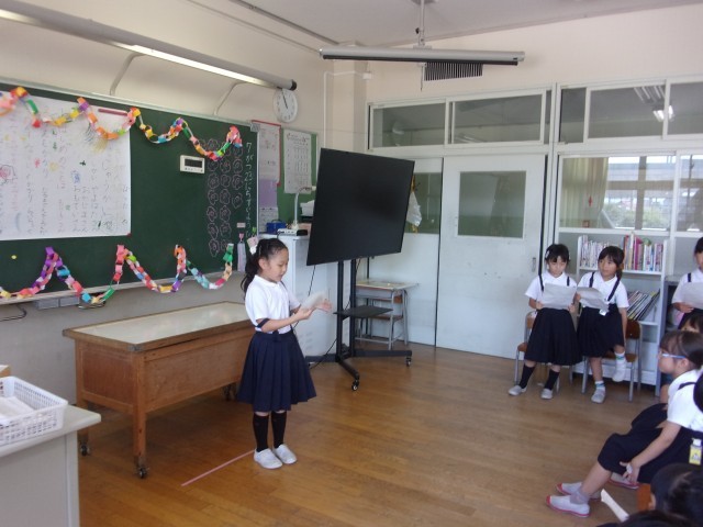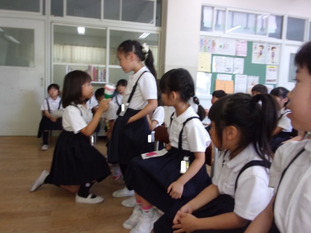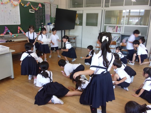 今日は、「1がっき がんばったね!しゅうかい」をしました。それぞれのチームで発表の内容を考え、今日まで準備をしてきました。どのチームもみんなが楽しめるように、工夫していたのがすばらしかったです。くじや景品を準備したり、持ち時間内で終われるように考えたりと、計画もしっかりできました。最後にみんなで歌った「ゆうき100%」もおおいにもりあがりましたね!インタビューコーナーでは、みんなが楽しそうでよかったなど、すてきな感想を言っていました。
