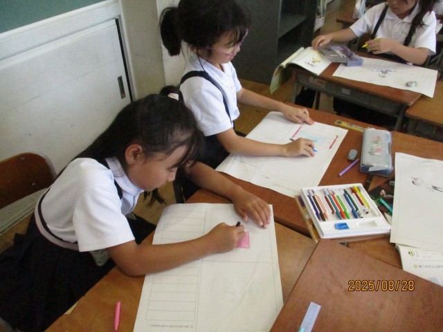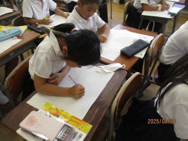 あったらいいなと思うものを描き、そのはたらきや、つくりを考えました。通学が楽になるものや、楽しみが増えるものをたくさん考えていました。今後、友達に説明したり、質問し合ったりする活動をしていきます。