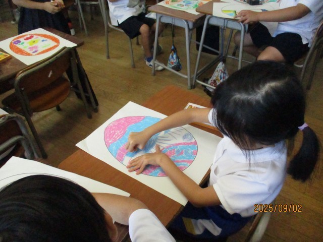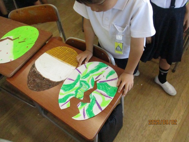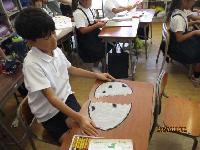 たまごから生まれてくるものを想像して、クレヨンでたまごの模様を描いたり、割れ方を考えてハサミで切ったりしました。次回は生まれてくるものも描いていきます。どんなものが生まれてくるのか楽しみです。