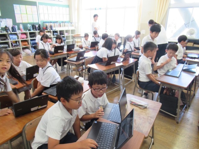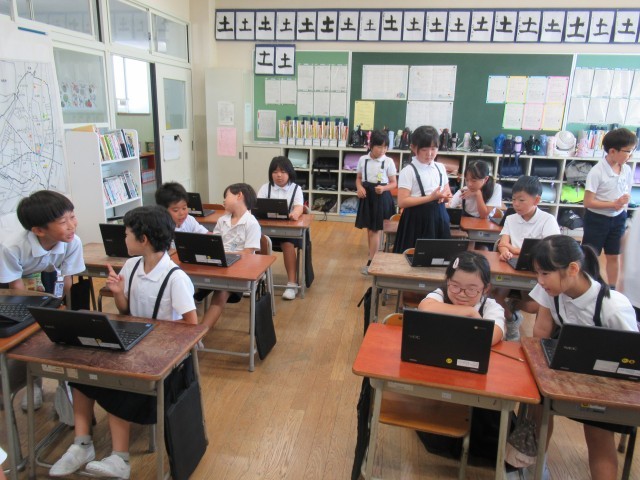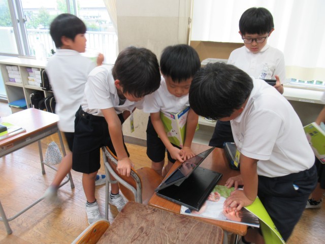 理科や社会、総合的な学習等でクロムブックを使ってスライドを作ったり、調べ学習をしたりしています。理科では植物の「実」と「種」について調べ、友達に調べたことを進んで伝え合いました。自分から疑問に思ったことを調べようと取り組む姿が見られます。