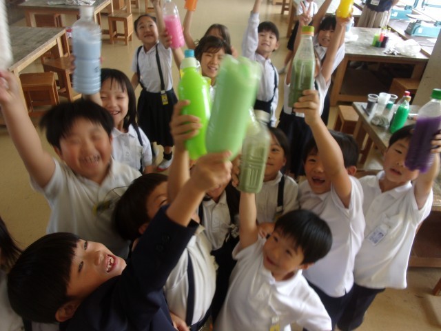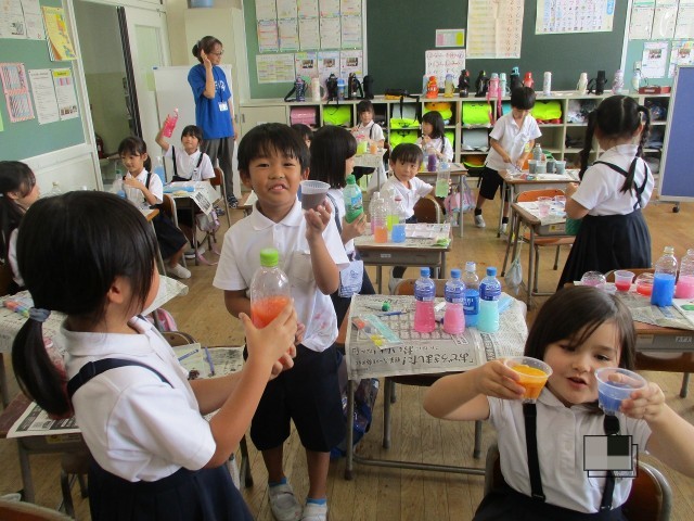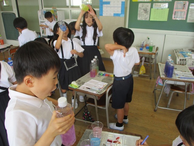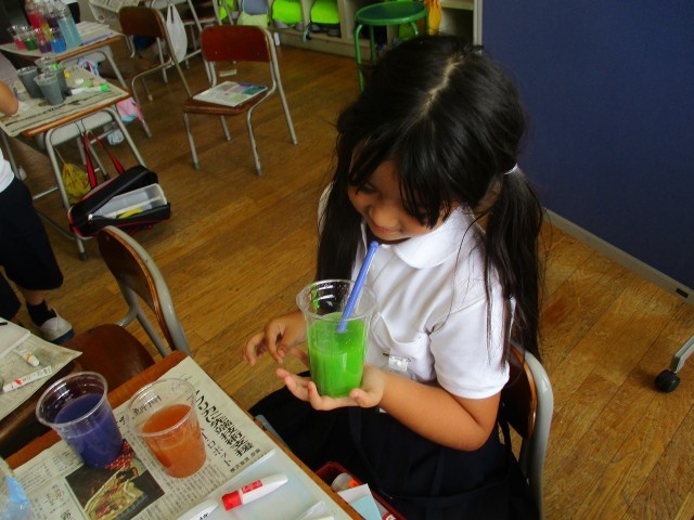 水の量を増やしたり、色水同士を混ぜたりして試行錯誤し、自分のつくりたい「ジュース」ができました。最後は、みんなで見せ合いました。