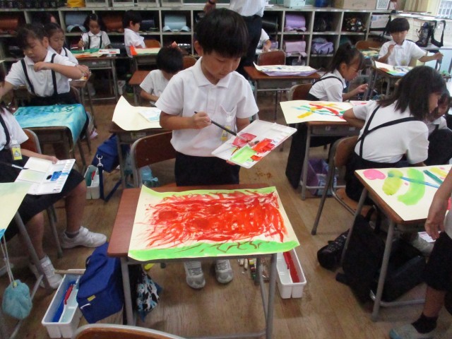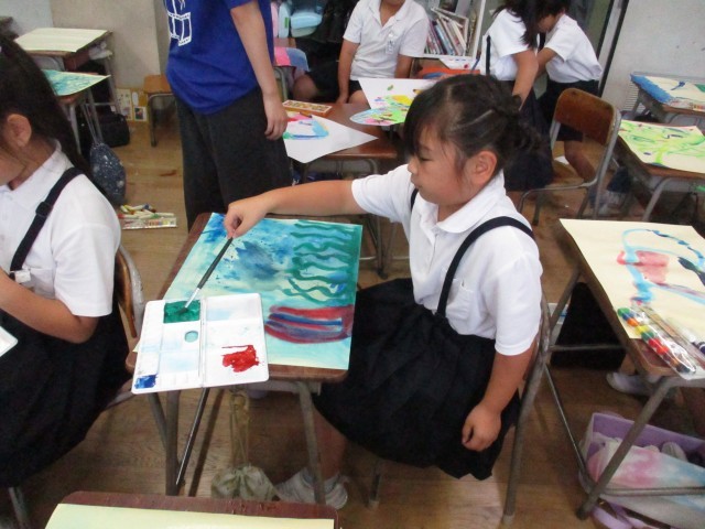「ふしぎなたまご」がありそうな背景を水彩道具を使って描きました。子供たちは空や海、火、植物などの背景をのびのびと描いていました。次回はいよいよ生まれてきたものを描きます。それぞれがつくったたまごから、何が生まれてくるか楽しみです。