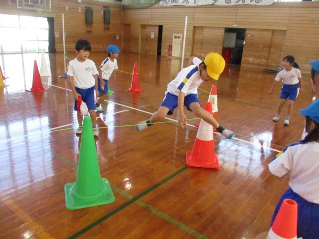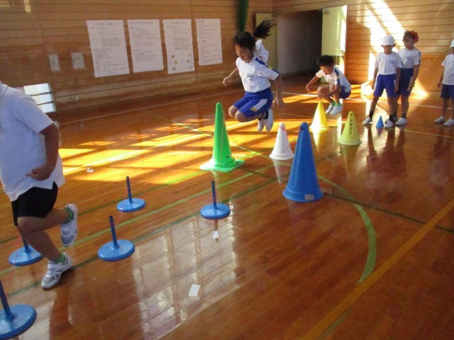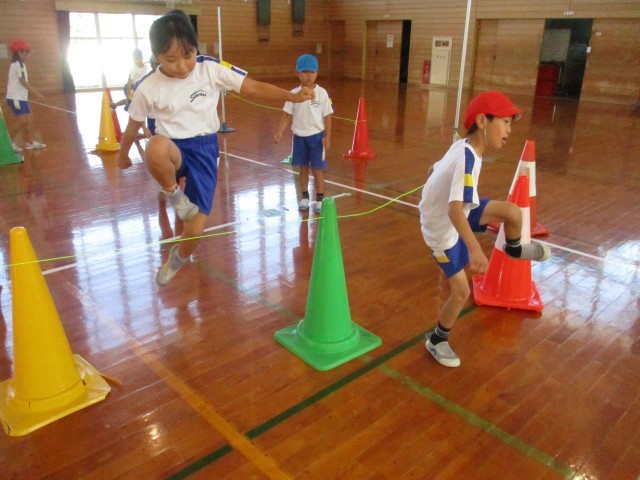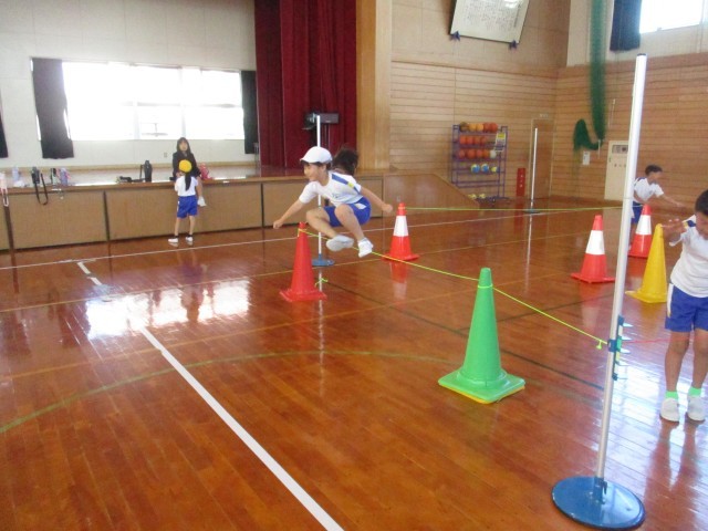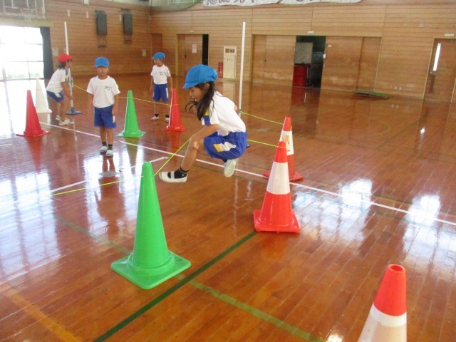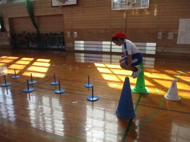 ゴムひもを使って、自分たちで高跳び遊びができるコースをつくりました。両足跳びや片足跳びなど、色々なジャンプを楽しみました。