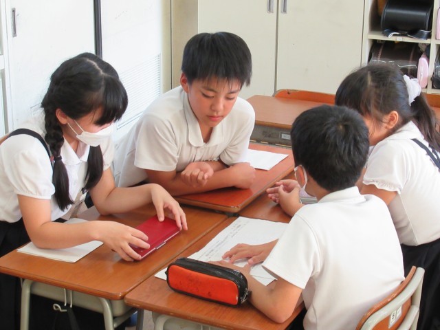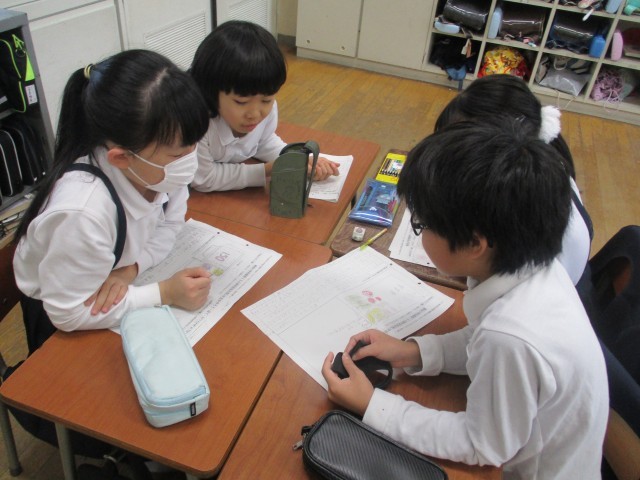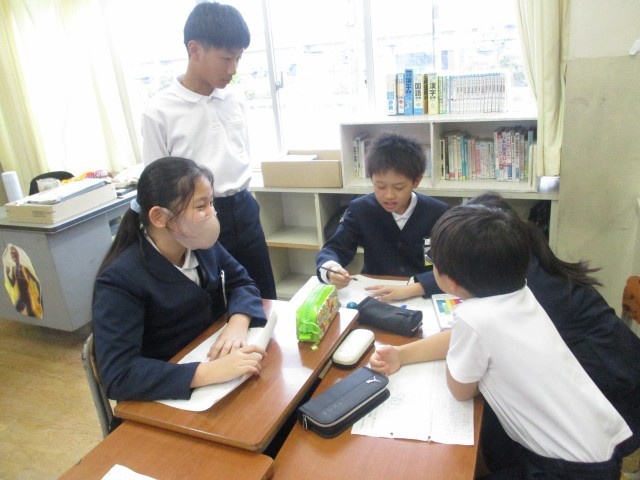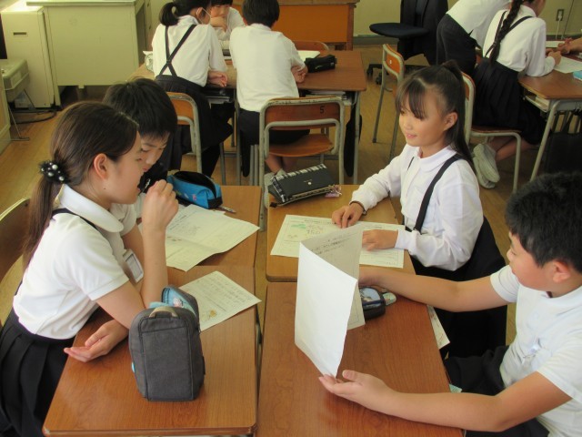総合的な学習の時間には、桜谷小学校創校150周年記念のお祝い弁当作りに取り組んでいます。今日は、個人で考えてきた弁当の案をグループで聴き合いました。「今まで桜谷小学校をつないできてくださった方々に感謝の気持ちを伝えたい」「桜谷小学校の素敵なところをおかずやデザインに表したよ」と、一人一人の思いが溢れる聴き合いとなりました。この後もたくさん話合いを重ね、世界で一つだけのお弁当を作ります。どんなお弁当ができるのか楽しみです。