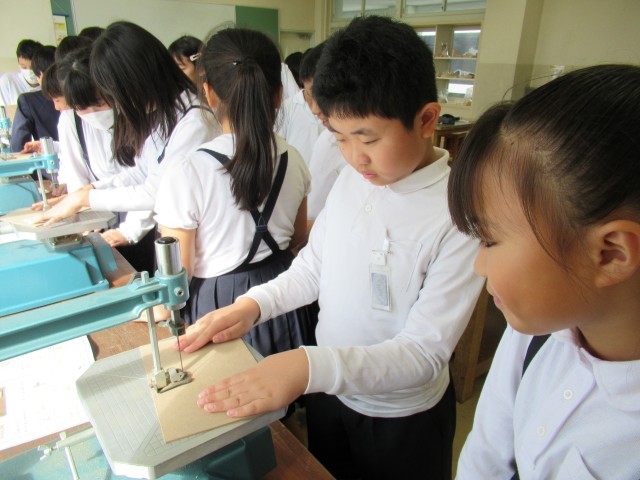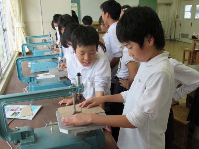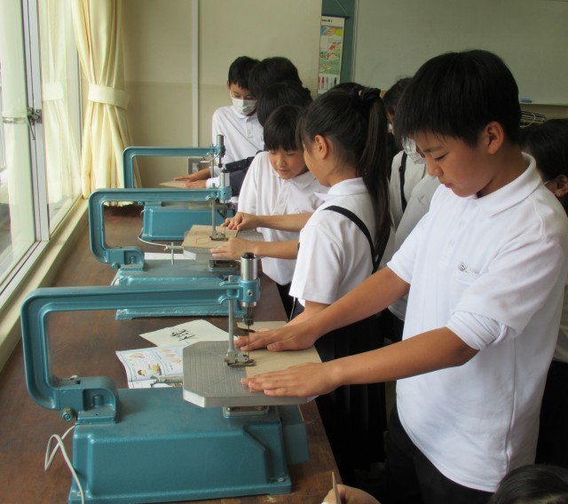 図画工作科の学習では、糸のこぎりを使っての立体作品の製作に取り組みます。