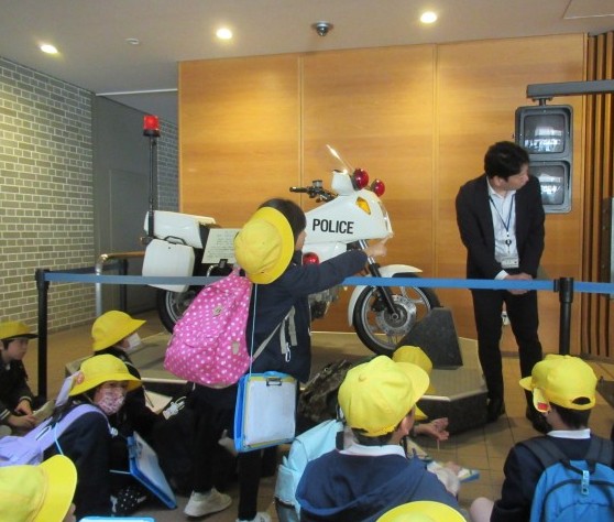 最後に、富山県警察本部へ行きました。本物の白バイや信号を見ながら警察の仕事についてお話を聞いたり、通信指令室や交通管制センターを見学したりしました。電光掲示板に表示されている通報件数が増えていくのを目の当たりにして警察という仕事の緊張感や地域の安全を守る大切さを感じている様子でした。