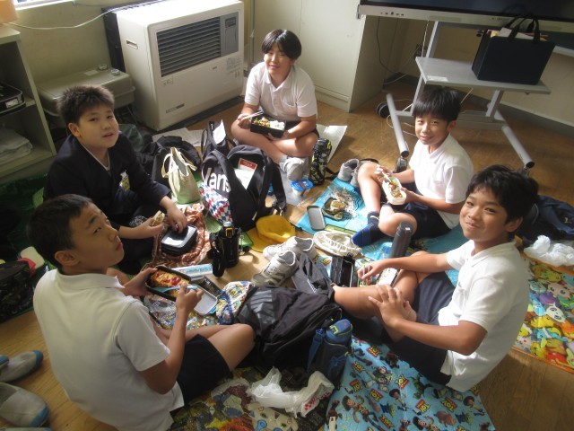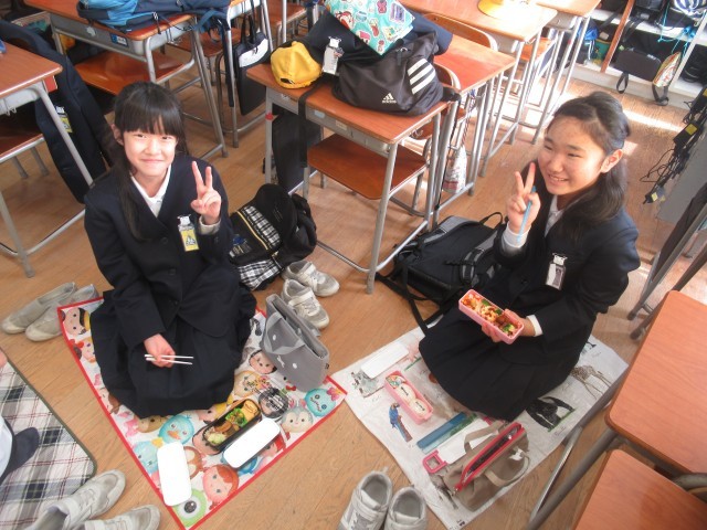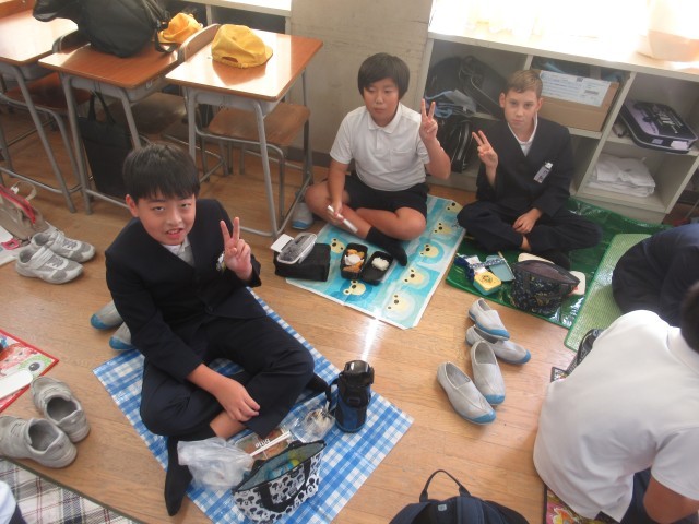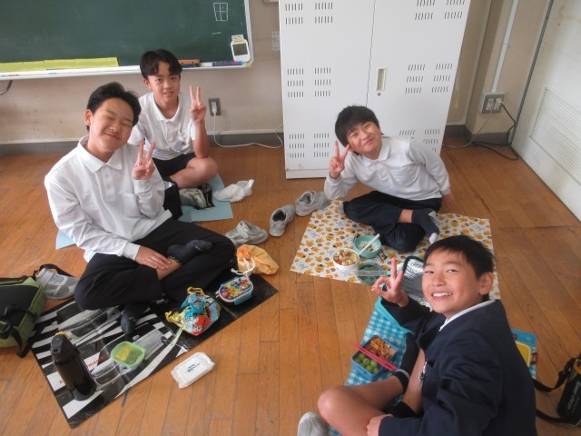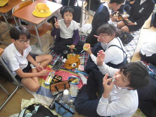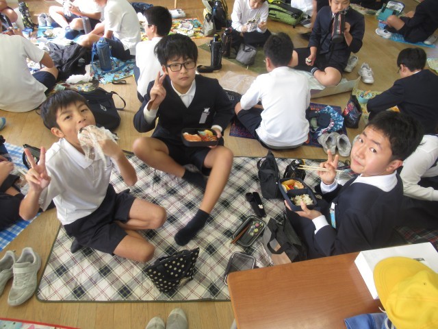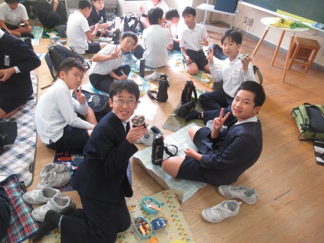 そして、当初は環水公園でお弁当を食べる予定でしたが、雨天のため学校に帰ってきてから教室で敷物を敷いてお弁当を食べました。